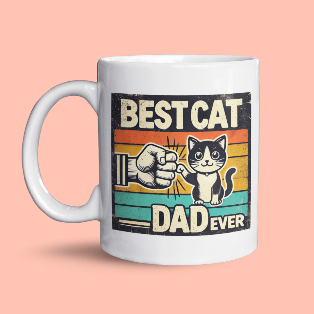 ▪ Ontwerp: Vintage stijl met tekst “Best Cat Dad Ever” en een schattige fistbump met je kat