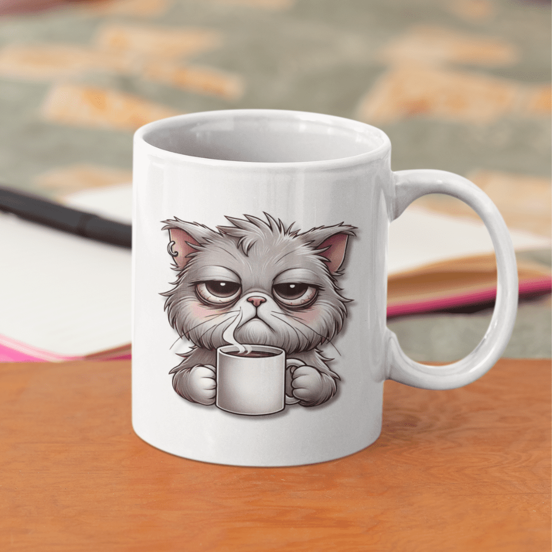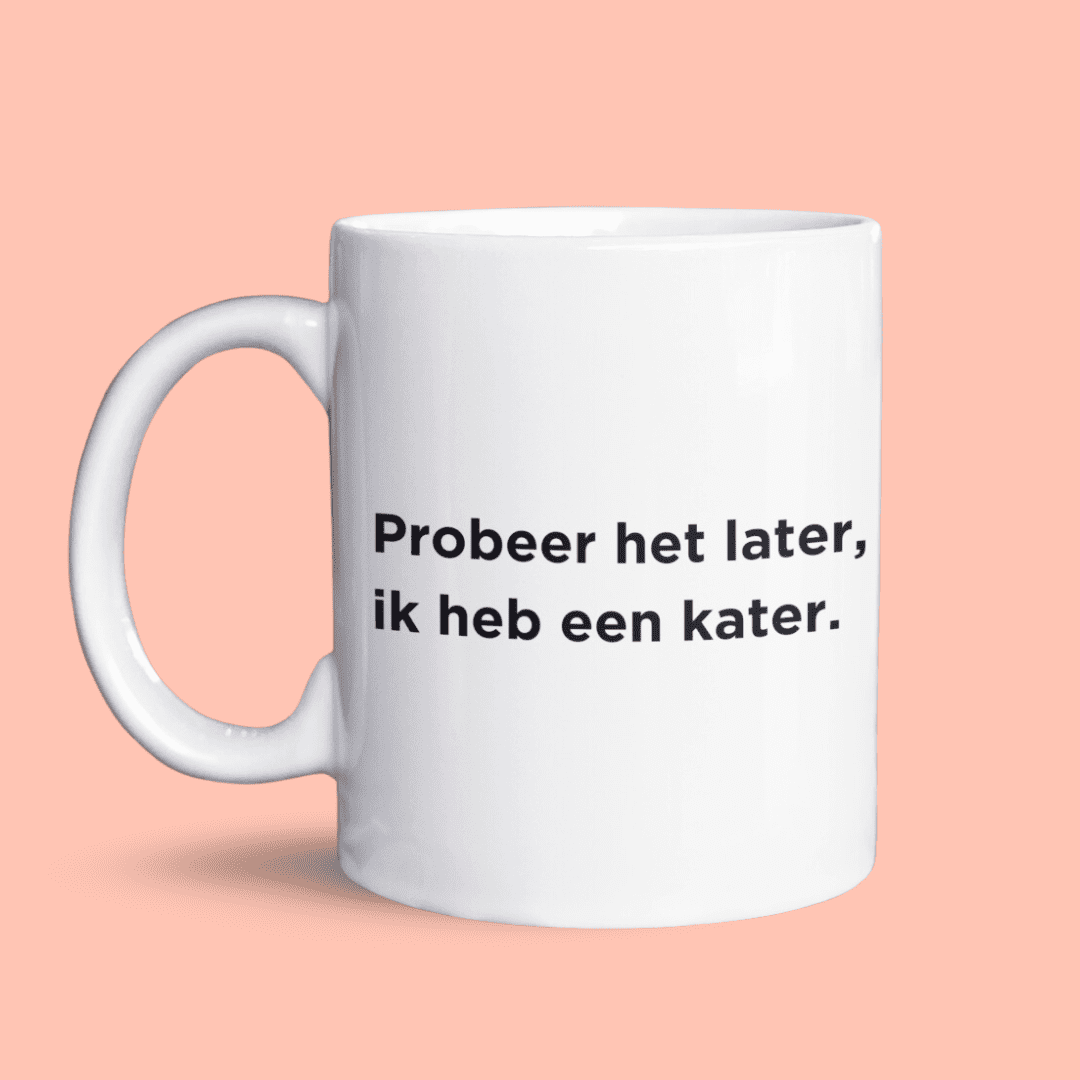 Met de tekst “Probeer het later, ik heb een kater” en een illustratie van een chagrijnige kat op de achterkant, is deze mok perfect voor iedereen die wel eens een zware ochtend heeft… of gewoon van katten en woordgrappen houdt. We hebben ook een mok in ons assortiment met een brak mannetje op de achterkant.