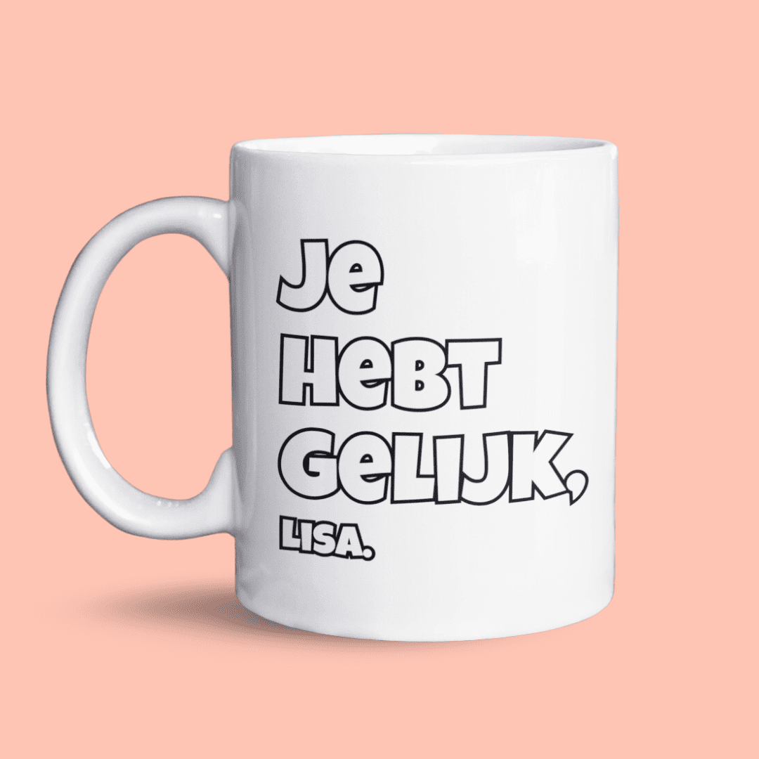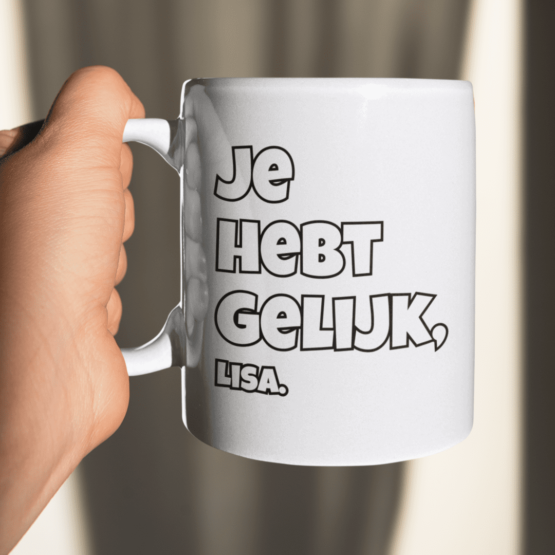 Met de Je hebt gelijk mok geef je iemand precies wat ze willen horen: dat ze (bijna) altijd gelijk hebben. Personaliseer de mok met een naam naar keuze en maak het ultieme cadeau voor je partner, collega, vriend of familielid.