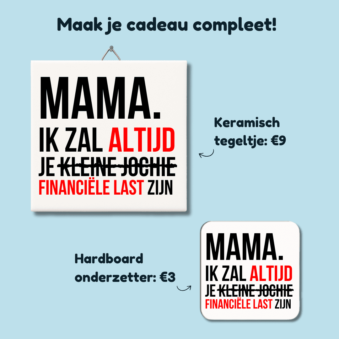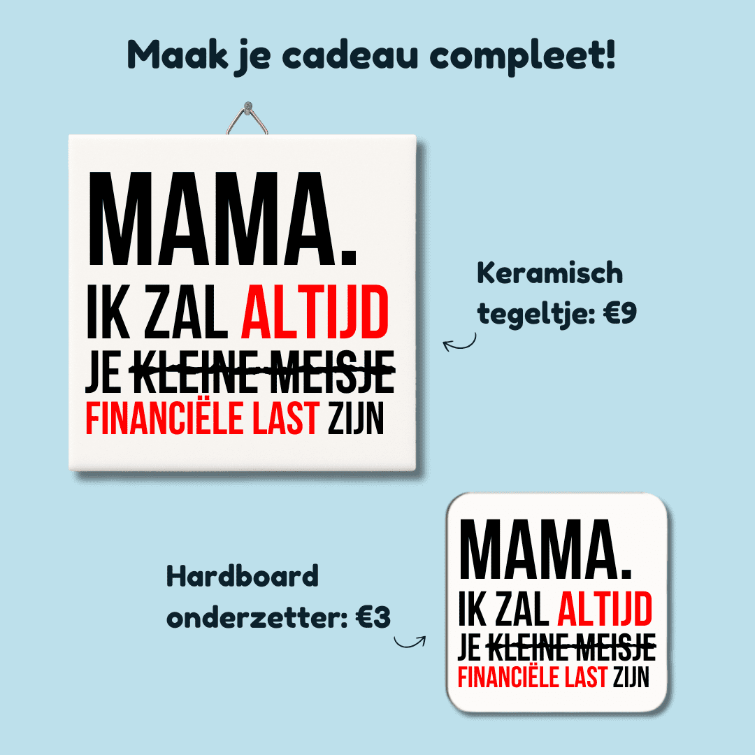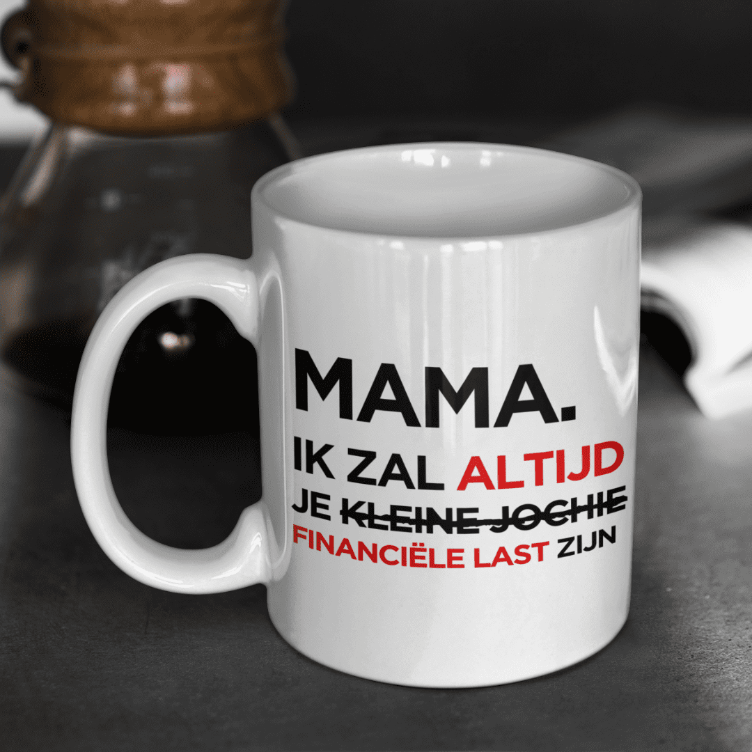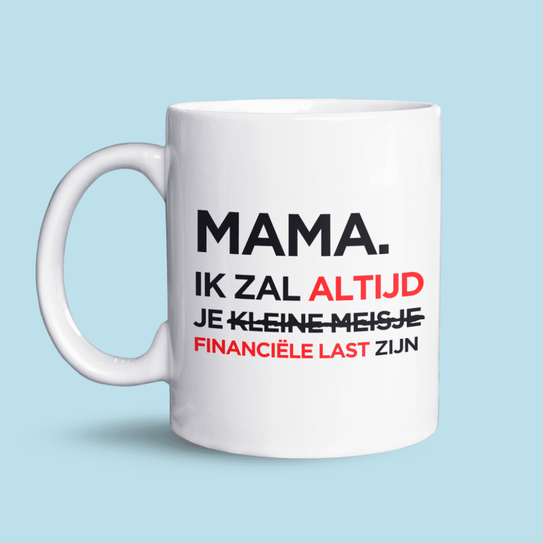 Op zoek naar een Moederdagcadeau of gewoon zomaar een kleinigheidje voor je ma? Deze mok zegt het zoals het is: “Mama, ik zal altijd je kleine meisje / jochie zijn” – of eigenlijk, je “financiële last”! Perfect om je moeder aan het lachen te maken tijdens haar dagelijkse kop koffie of thee. We hebben trouwens ook een PAPA-variant.