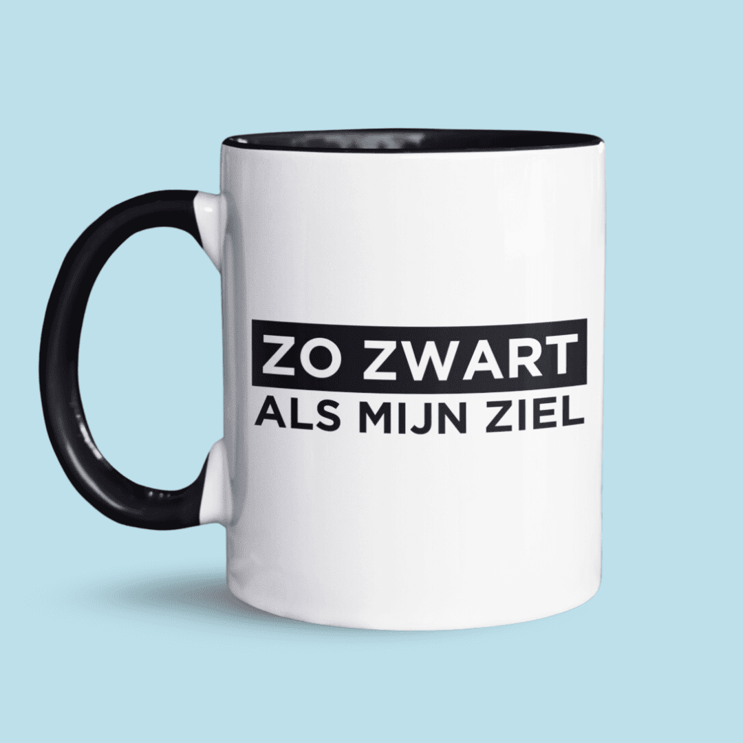 - Grappige mok met tekst: “Zo zwart als mijn ziel” – een knipoog voor liefhebbers van zwarte humor.