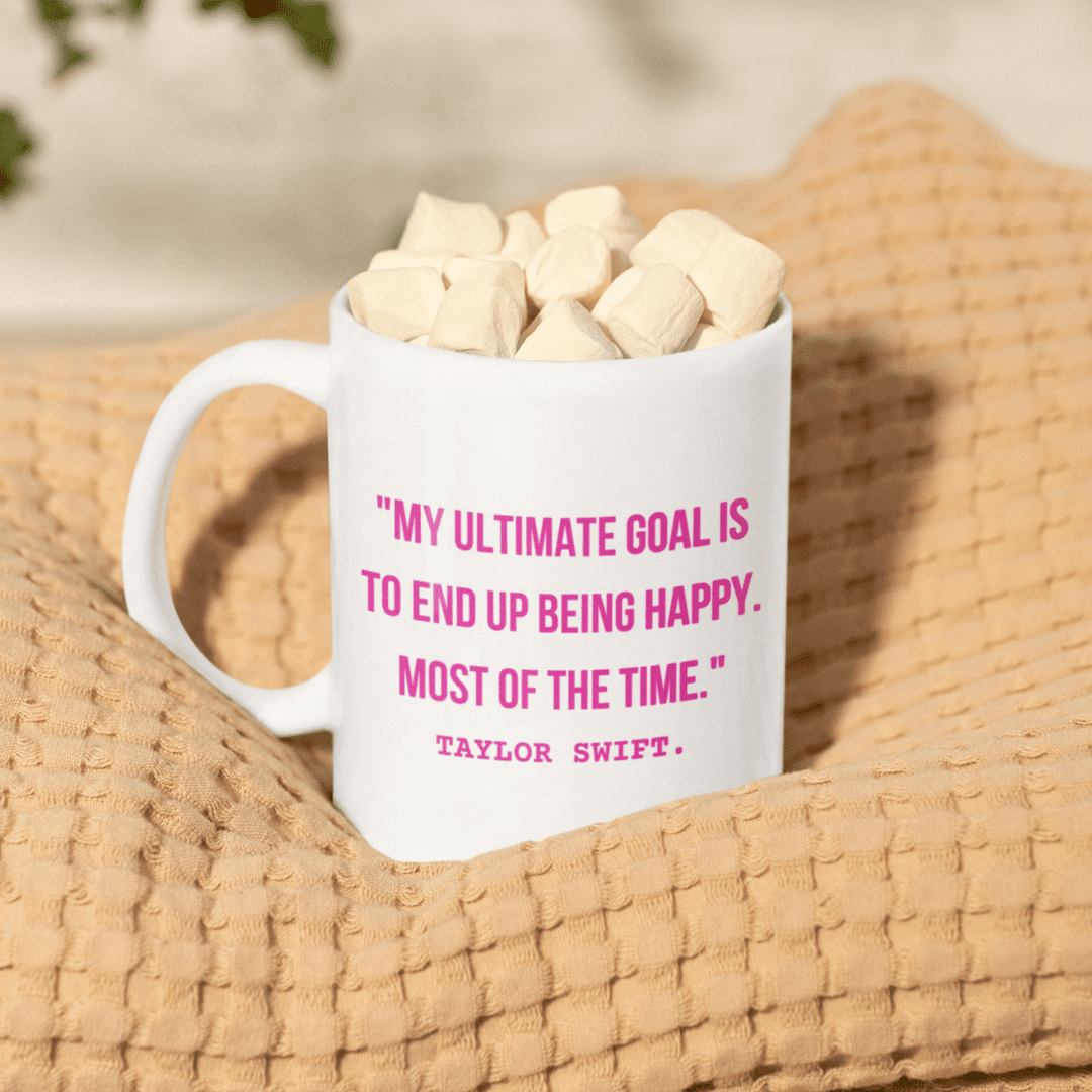 Een mok vol inspiratie en humor! Met het grappige en positieve citaat “My Ultimate Goal is to End Up Being Happy, Most of the Time” van Taylor Swift is deze mok perfect voor fans én iedereen die zijn dag met een glimlach wil beginnen. Voeg een vleugje Swiftie-vibes toe aan je koffie- of theemoment!