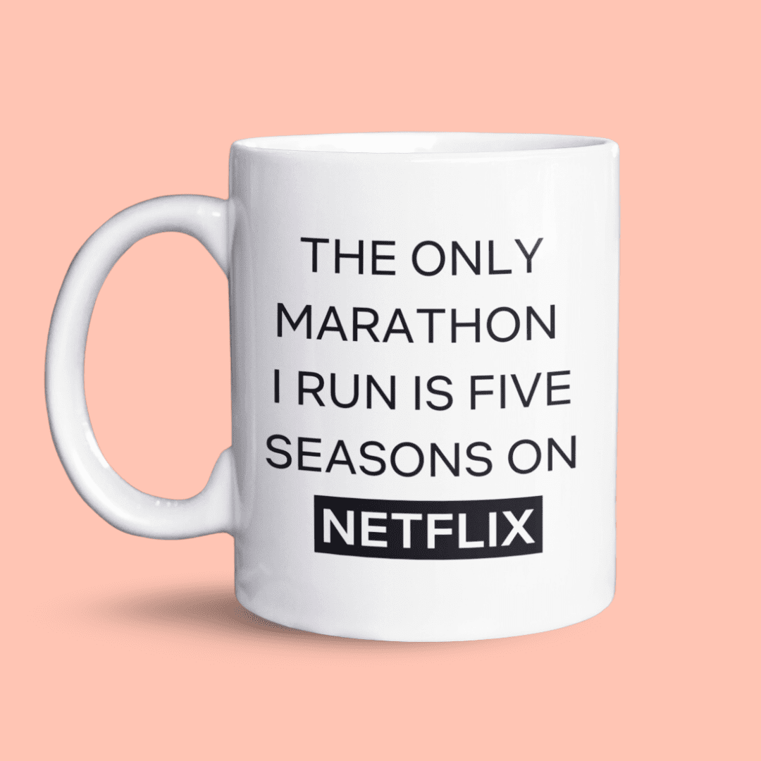 Deze grappige mok is perfect voor iedereen die graag series kijkt! Met de tekst “The only marathon I run is five seasons on Netflix” zorgt hij voor een lach terwijl je van je favoriete show geniet. Gemaakt van stevig keramiek, met een inhoud van 325 ml, ideaal voor koffie of thee. Vaatwasser- en magnetronbestendig, dus superhandig. Een leuk cadeau voor binge-watchers!