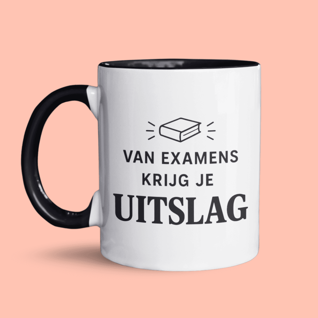 Omdat een beetje zelfspot altijd werkt. En omdat je nu eenmaal liever lacht om je examen dan dat je er weer aan moet beginnen. We verkopen deze mok ook als set met een tegeltje erbij.